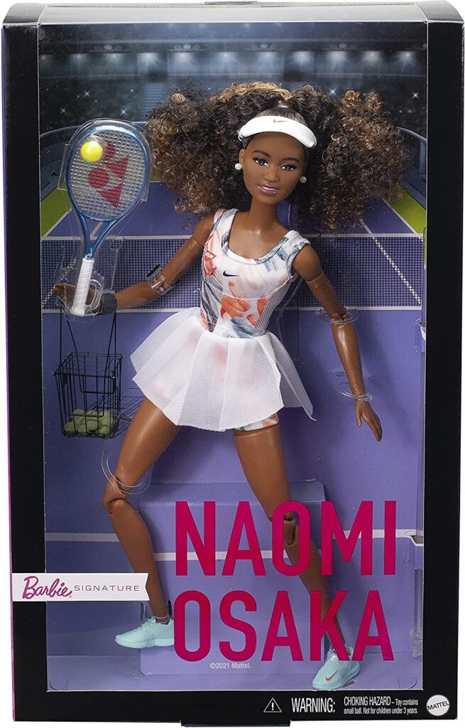 バービー大坂なおみドールは、2020年のメジャー試合で彼女が着用したルックにインスピレーションを得た、筆文字プリントのナイキのテニスドレスを着用しています。