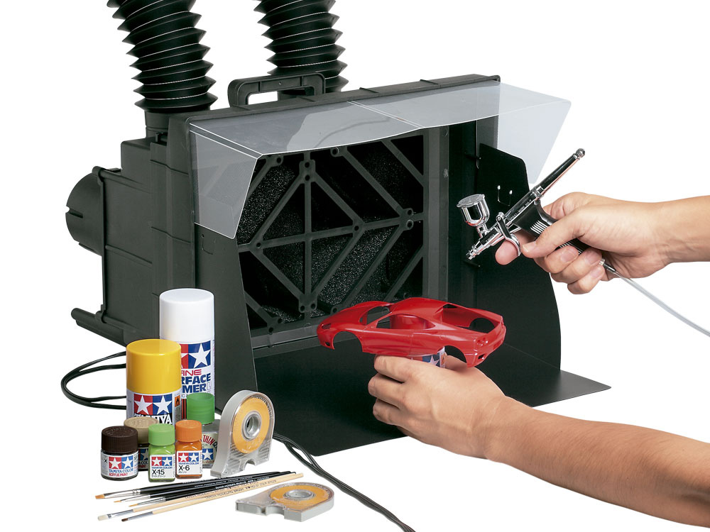 室内での吹き付け塗装を強力にサポートする塗装ブースです。スプレーワーク ペインティングブースII(ツインファン)は、前面パネルの特殊構造がポイント。パネル外周部にスリット状の吸気口を配置して、中心部から外れた塗料ミストも吹き返すことなく吸引。中心部の塗料ミストはフィルターを3回通過してから吸気口に吸い込まれるため、フィルターの目詰まりによる急激な吸引力低下を起こしにくい構造です。しかも、音の静かなシロッコファンを2基装備。余裕の排気風量を実現しました。迷彩などの繊細な吹き付け塗装時はもちろん、1/35MMや1/24カーモデルの缶スプレー塗装にも十分対応します。